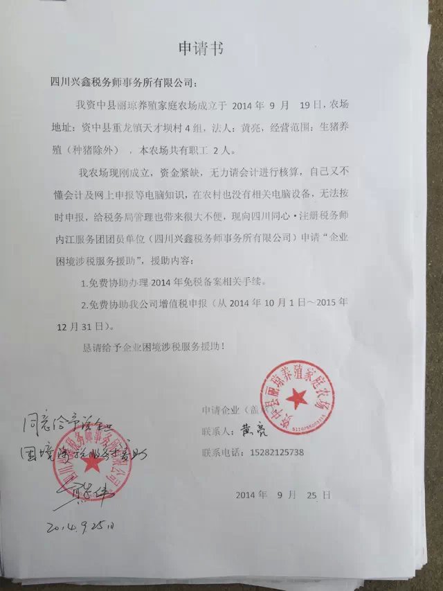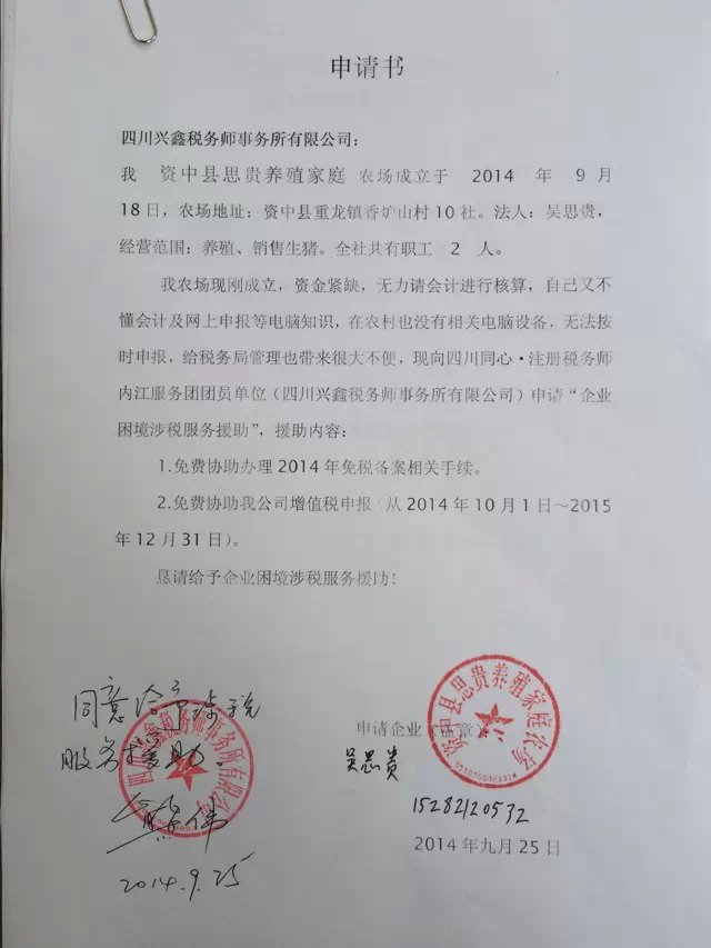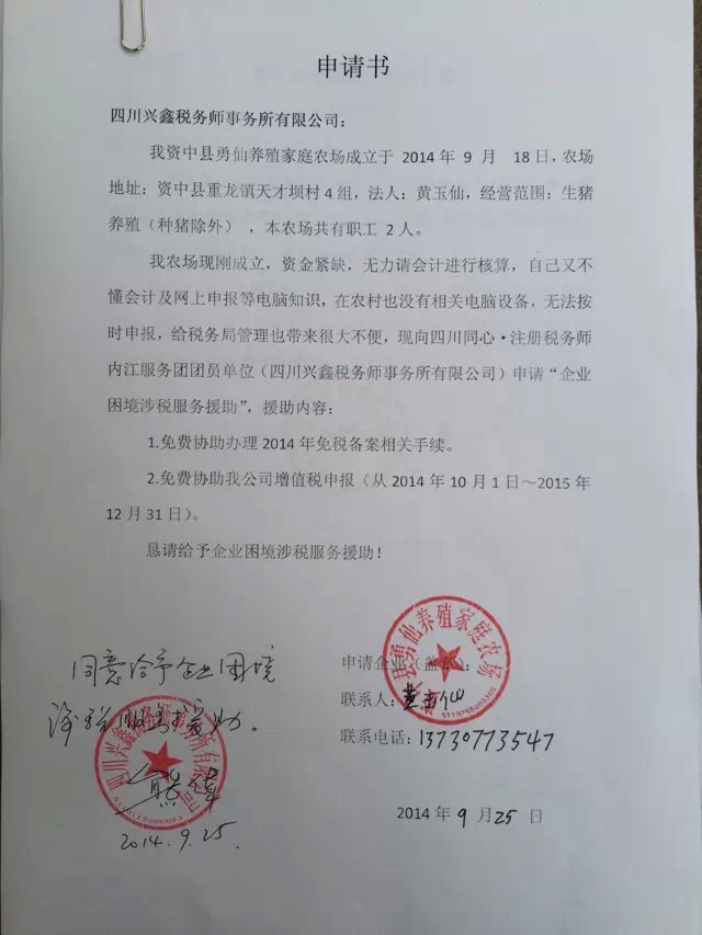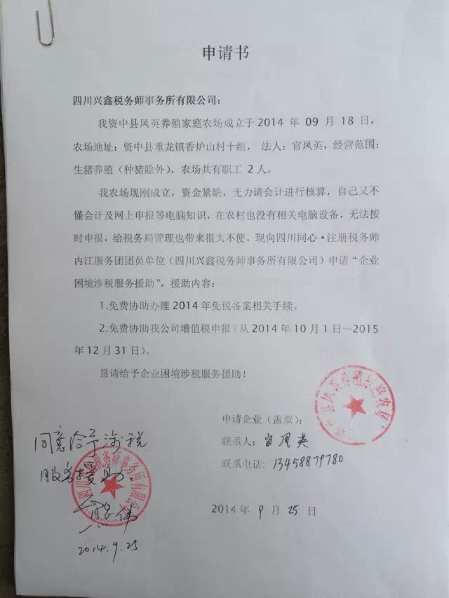 為托起困境企業(yè)騰飛的翅膀,為解決當(dāng)?shù)囟悇?wù)分局征管上的難題,四川同心·注冊(cè)稅務(wù)師服務(wù)團(tuán)團(tuán)員單位(四川興鑫稅務(wù)師事務(wù)所有限公司)愿為這些請(qǐng)不起會(huì)計(jì)、又無(wú)力自行申報(bào)的農(nóng)庭農(nóng)場(chǎng)進(jìn)行涉稅服務(wù)免費(fèi)援助。目前共20戶家庭農(nóng)場(chǎng)申請(qǐng)了困境企業(yè)涉稅服務(wù)免費(fèi)扶助(詳見后附申請(qǐng)書)